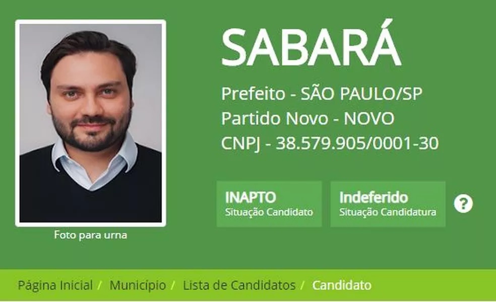 Sabará foi expulso do Novo na última quinta-feira (21) devido a processo no conselho de ética do partido que apontou inconsistências em seu currículo. Sua candidatura seguia válida, até este domingo, graças a um recurso e a uma liminar no Tribunal Superior Eleitoral (TSE).